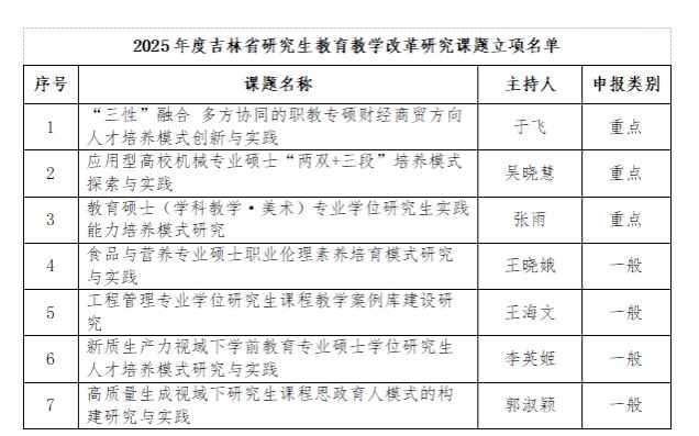 根据《关于开展2025年度吉林省研究生教育教学改革研究课题申报工作的通知》要求,经个人申报、部门推荐、学校初审把关、专家评审打分,按省教育厅限额推荐要求,beat365推荐申报课题10项。经省教育厅组织专家评审,beat365获立7项研究生教育教学改革研究课题,其中重点课题3项、一般课题4项。具体立项名单详见下表。