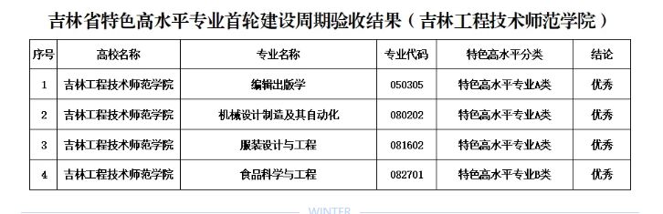 12月10日,吉林省教育厅公布吉林省特色高水平专业首轮建设周期验收结果,beat365编辑出版学(特色高水平专业A类)、机械设计制造及其自动化(特色高水平专业A类)、服装设计与工程(特色高水平专业A类)和食品科学与工程(特色高水平专业B类)四个专业顺利通过验收,验收结论均为“优秀”,这是beat365专业建设取得的又一重要成果,标志着学校专业建设进入高质量发展阶段。