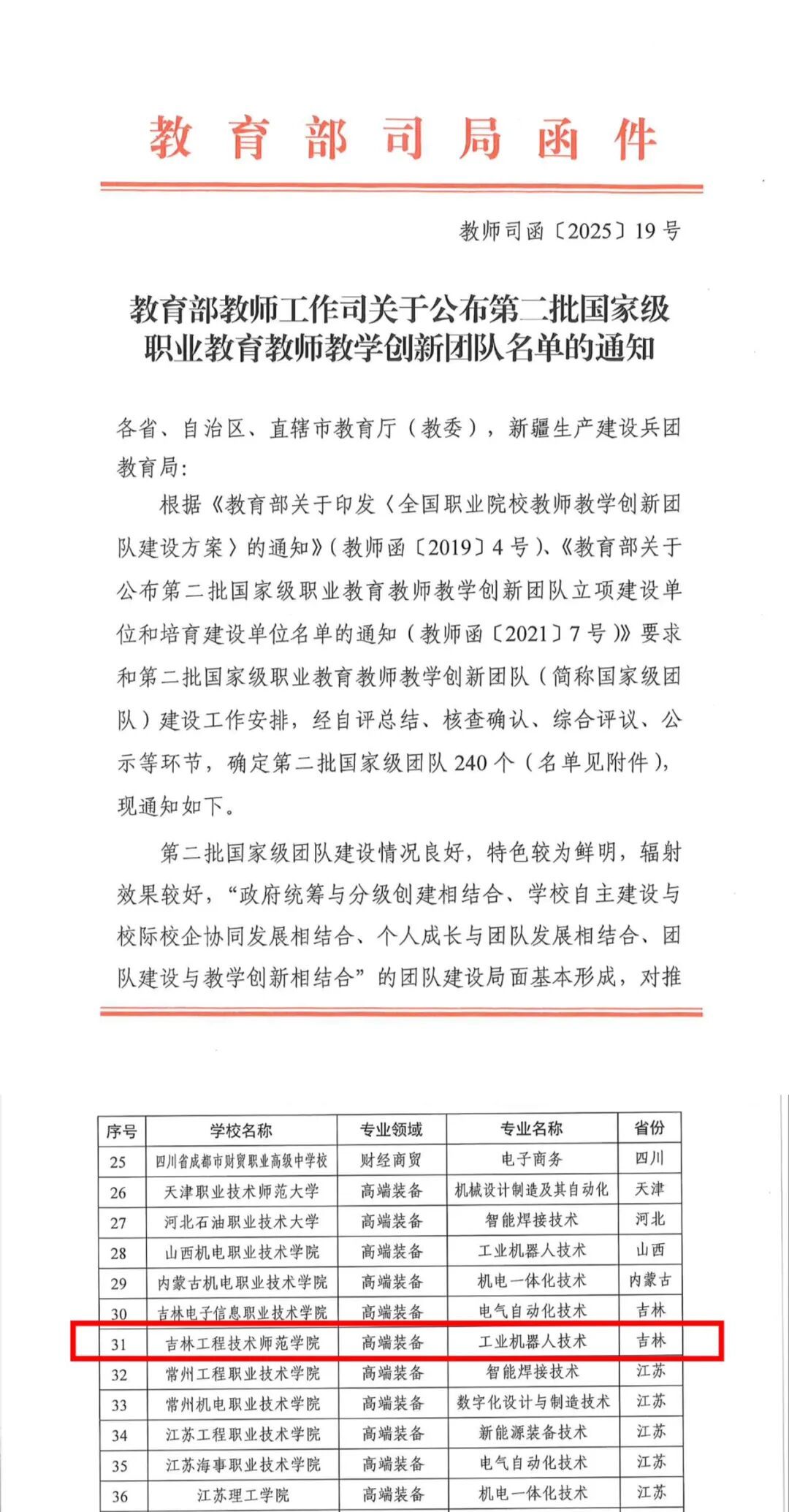 近日,教育部教师工作司公布了第二批国家级职业教育教师教学创新团队名单,beat365工业机器人技术职业教育教师教学创新团队圆满完成各项建设任务,顺利通过验收。标志着beat365在深化教育教学改革、打造高水平“双师型”教师队伍方面取得了重要成就,为全国职业教育教师团队建设提供了可借鉴的“工师”样板。