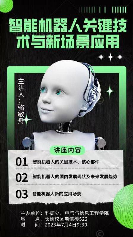 时间、地点:2023年7月4日,电信楼522室 主办单位:电气与信息工程学院、科研处 讲座内容:从机器人关键技术、核心部件、国内机器人发展现状、未来发展趋势、新应用场景等维度详细介绍人机共融机器人、医疗机器人、足式智能机器人、特种仿生机器人。