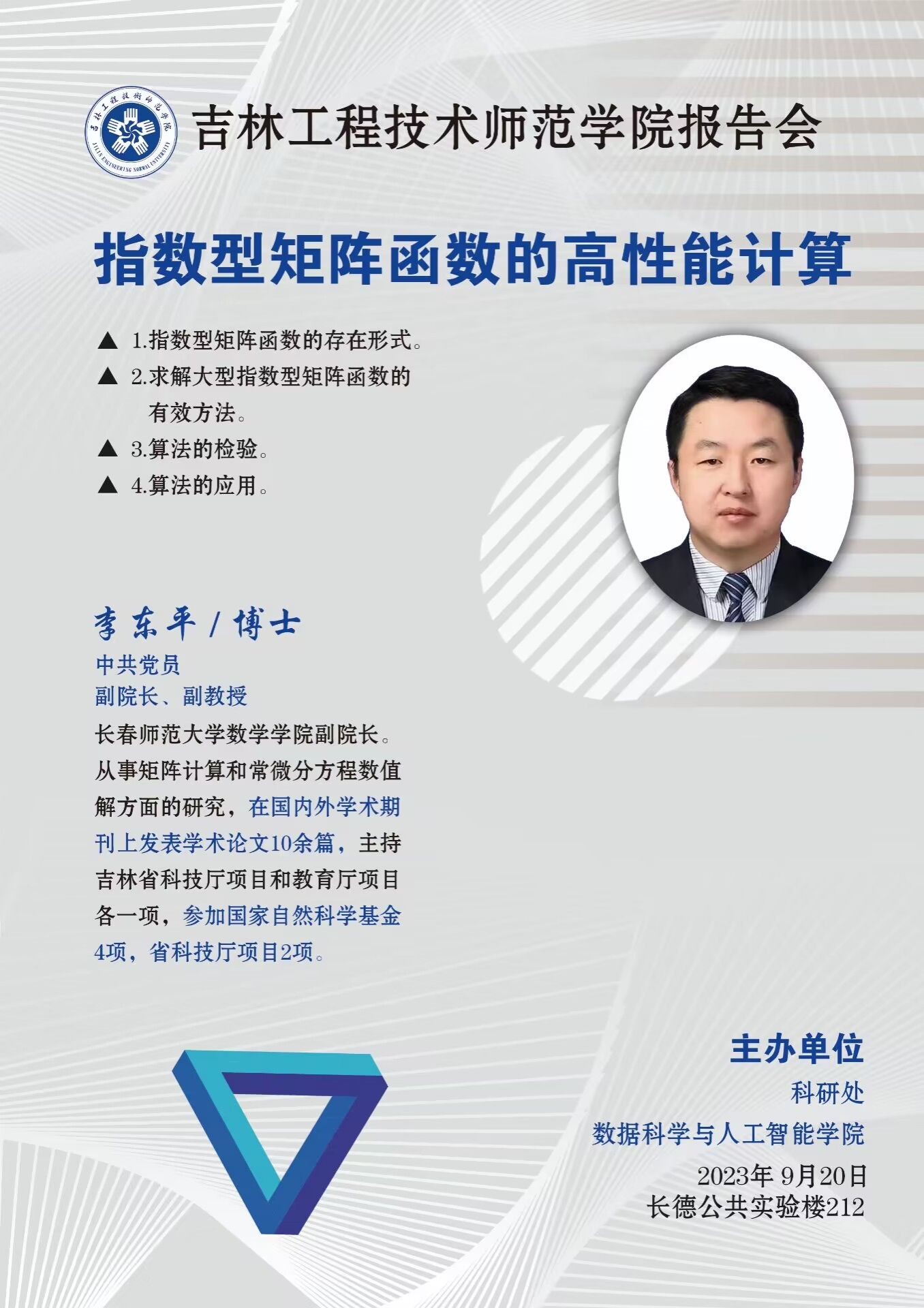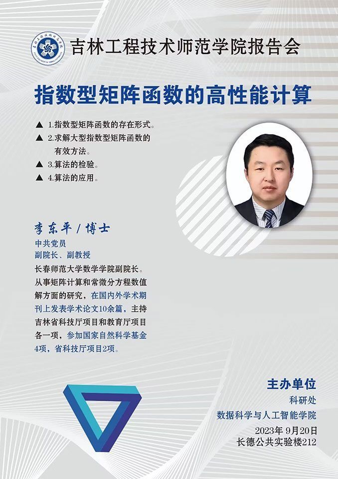 主讲人:李东平,男,长春师范大学副教授时间、地点:2023年9月20日,数据科学与人工智能学院会议室主办单位:数据科学与人工智能学院、科研处讲座内容:1.指数型矩阵函数的存在形式;2求解大型指数型矩阵函数的有效方法;3.算法的检验;4.算法的应用。