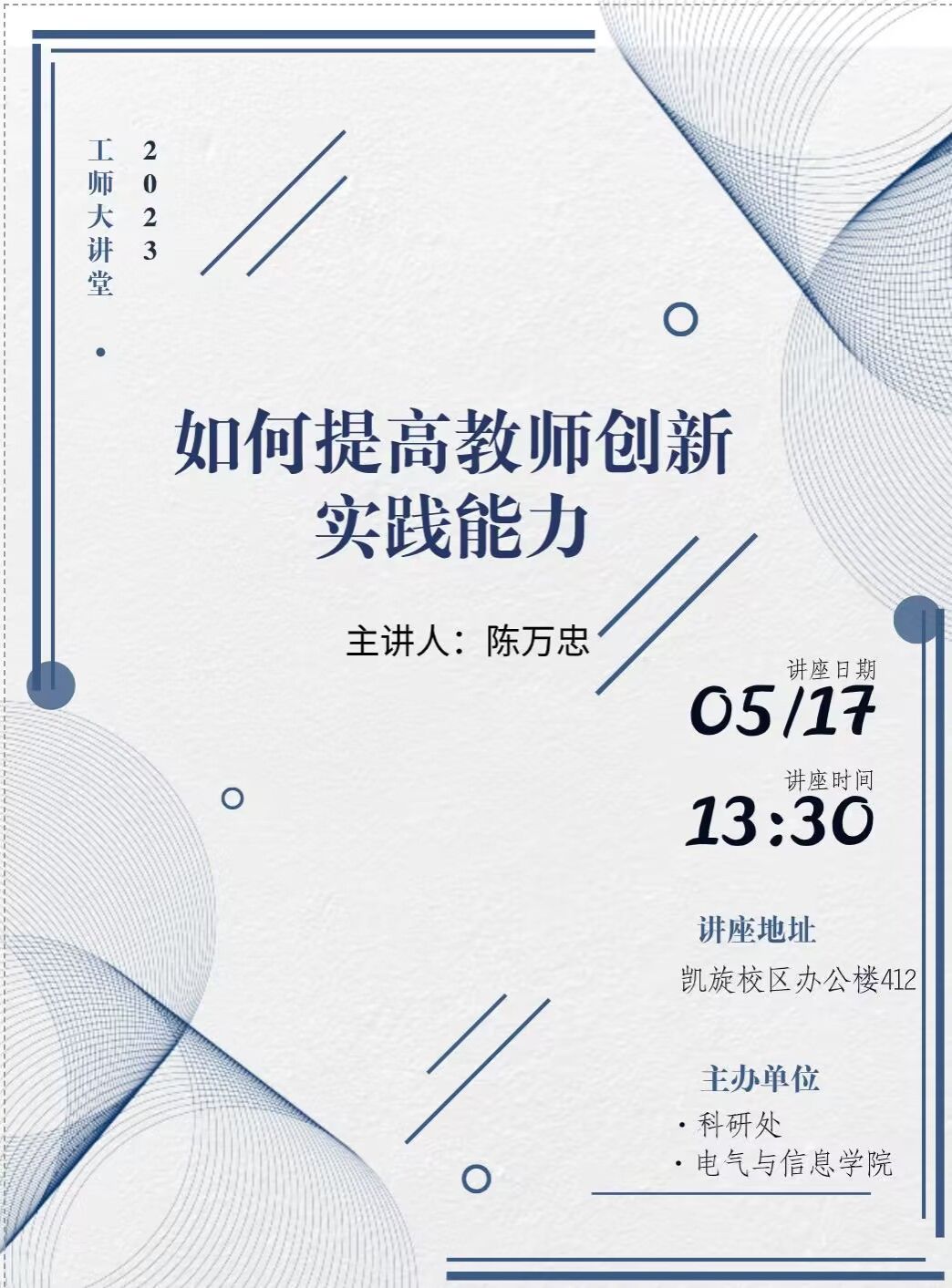 时间、地点:2023年5月17日,主办单位:电气与信息工程学院、科研处讲座内容:1.以问题为切入点,通过教师的成长典型案例,为教师创新能力的提高找到学习的榜样;2.通过总结吉林大学、长春工业大学、吉林师范大学、长春工程学院、长春科技学院,提高教师创新能力的经验做法,分析提高教师创新能力的途径和方法;3.体会与感想。