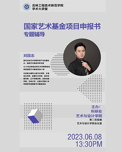 主讲人:刘国志,男,吉林艺术学院教授时间、地点:2023年4月13日,艺术与设计学院会议室主办单位:艺术与设计学院、科研处.讲座内容:1.国家艺术基金项目资助管理政策,国家艺术基金资助项目整体情况讲解;2.人才培训资助项目、传播交流推广资助项目、美术创作资助项目申报要点分析;3.答疑解惑,强调申报时需要避免的事项