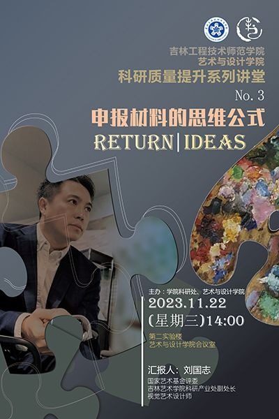 主讲人:刘国志,男,吉林艺术学院教授时间、地点:2023年10月25日,艺术与设计学院会议室主办单位:艺术与设计学院、科研处讲座内容: 1.艺术创作与科研项目的区别;2.如何养成创作项目思维;3.项目案例解析。