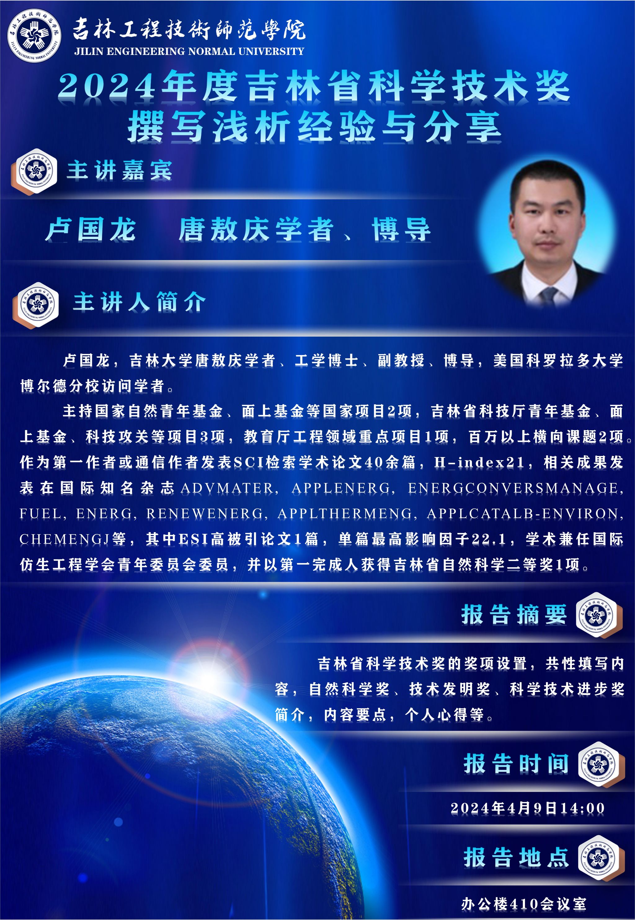 主讲人:常志勇 国家“万人计划”青年拔尖人才 吉林大学“唐敖庆学者”领军教授、博士生导师时间、地点:2023年12月8日13:30,凯旋校区办公楼410会议室主办单位:科研处讲座内容:1. 立项背景及项目简介;2. 主要科技创新点和创新内容;3. 客观评价;4. 国内外同类技术综合比较情况;5. 推广应用情况及经济社会效益。