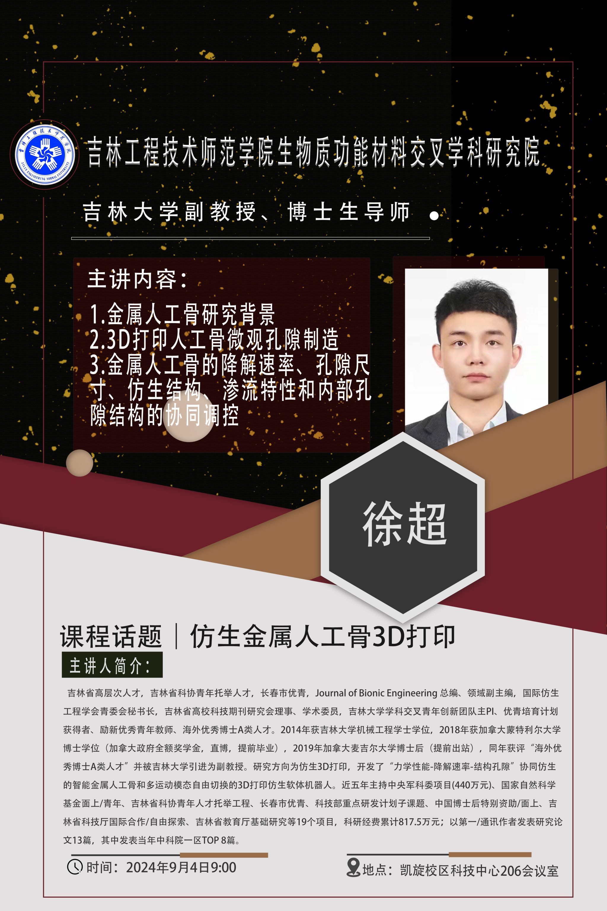 主讲人:徐超,吉林大学副教授,博士生导师时间、地点:2024年9月4日9:30 凯旋校区科技中心206会议室主办单位:生物质功能材料交叉学科研究院、科研处讲座内容:1.金属人工骨研究背景;2.3D打印人工骨微观孔隙制造;3.金属人工骨的降解速率、孔隙尺寸、仿生结构、渗流特性和内部孔隙结构的协同调控。