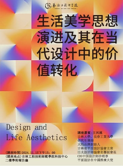 主讲人:王兴洮 ,长春人文学院副教授时间、地点:2024年11月15日15:00 科技中心二楼报告厅主办单位:艺术与设计学院、科研处讲座内容:1.生活美学思想的演进与造物风格特征的变化;2.生活美学思想在当代设计理论中的回响;3.生活美学思想重塑中国设计的推进路径。
