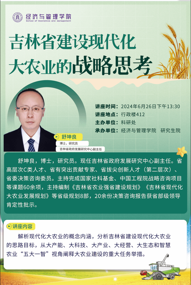 主讲人:舒坤良,吉林省政府发展研究中心,副主任时间、地点:2024年6月26日13:30 凯旋校区办公楼410主办单位:经济与管理学院、研究生院、科研处讲座内容:1.解析现代化大农业的概念内涵;2.分析吉林省建设现代化大农业的思路目标;3.从大产能、大科技、大产业、大经营、大生态和智慧农业“五大一智”视角阐释大农业建设的重大任务举措。