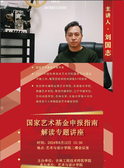 主讲人:刘国志,吉林艺术学院,教授时间、地点:2024年6月12日 艺术与设计学院会议室 15:30主办单位:艺术与设计学院、科研处讲座内容:1.申报类别分析;2.项目论证方法;3.成果形式构成。