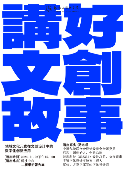 主讲人:夏远昭 , 吉林省平面设计协会副教授时间、地点:2024年11月22日15:00 二实验楼408主办单位:艺术与设计学院、科研处讲座内容:1.地域文化元素在文创设计的应用价值;2.地域文化在文创设计中的交叉创新;3.地域文化在文创设计中的数字化创新。